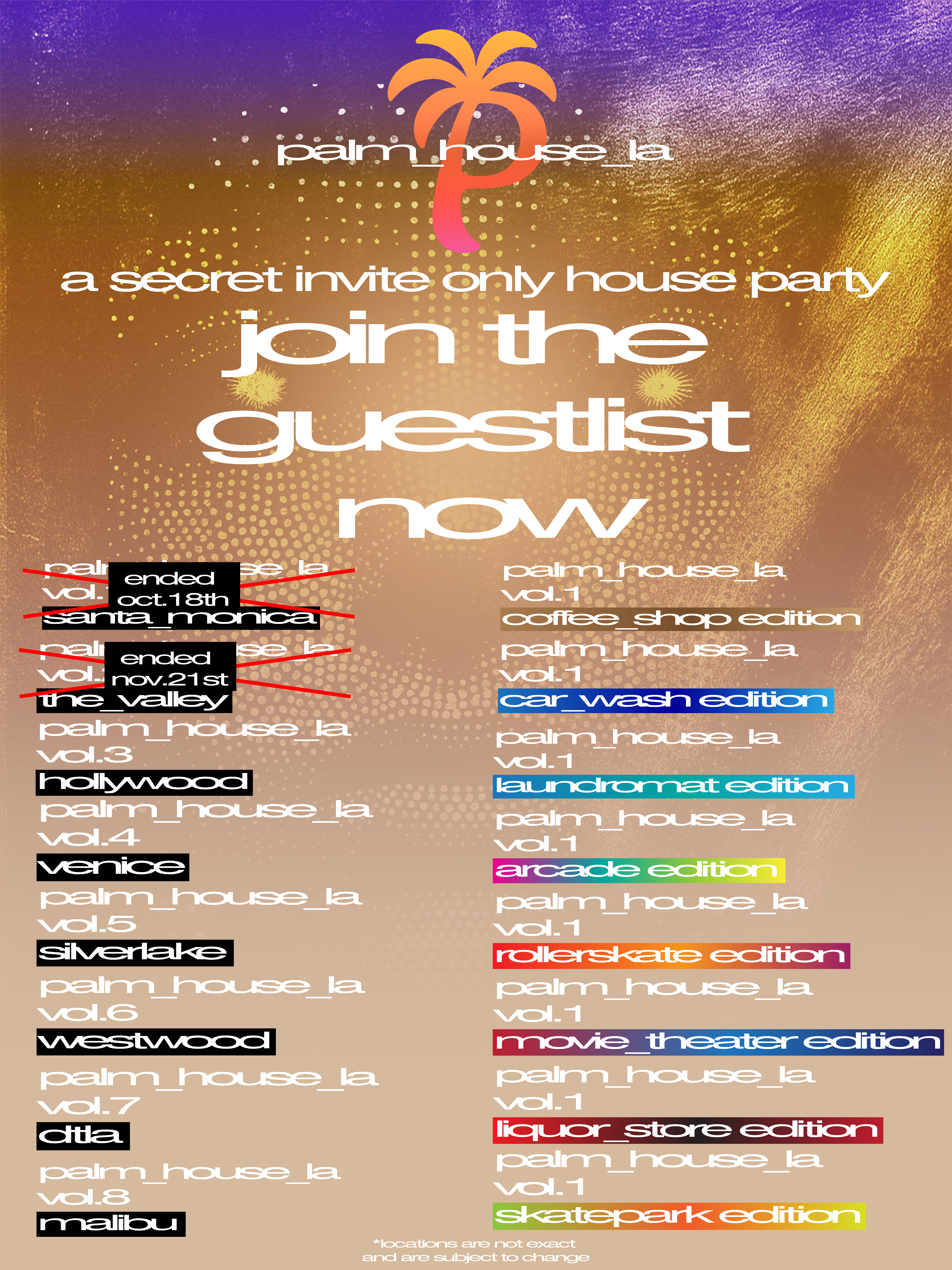 Palm House is a private party series born in Los Angeles, house and dance at the core, early 2000s spirit with a modern engine. Think apartment pregame energy meets hidden lounge, the room moves together, the city forgets the clock. No velvet ropes, no clout hunting, just bodies in rhythm. A modern LA spin on house culture where the coastline meets the dance floor.